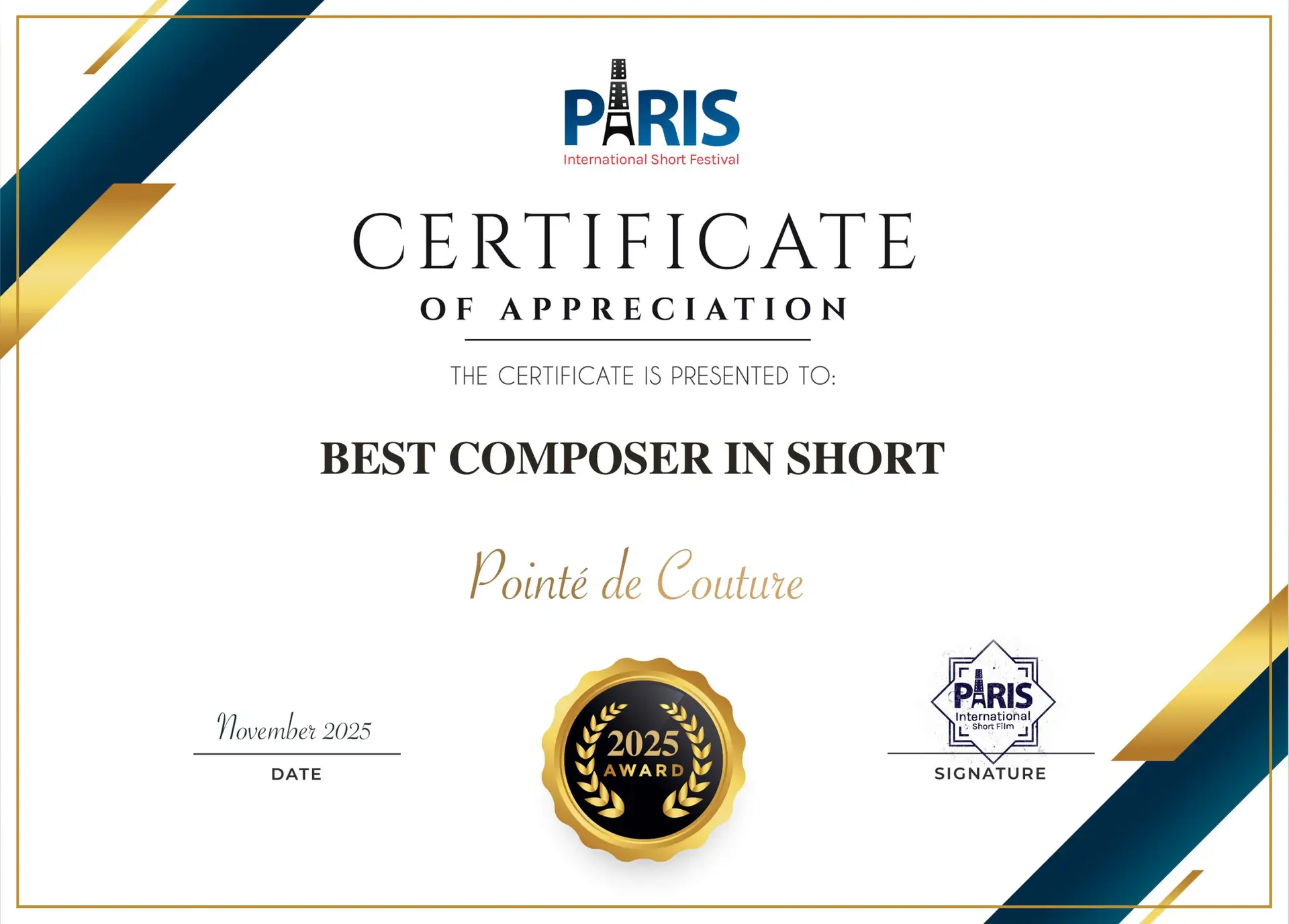 Pointé de Couture Wins Best Composer in Short at Paris International Short Festival